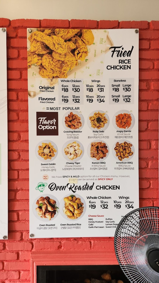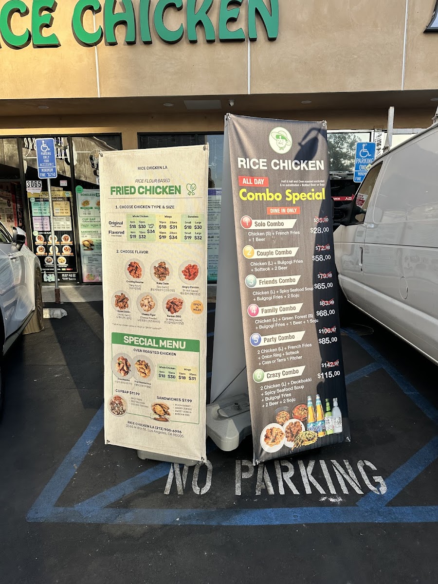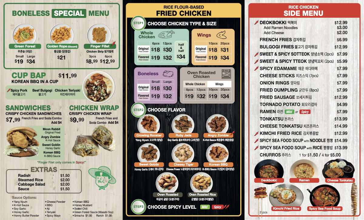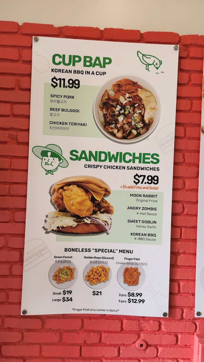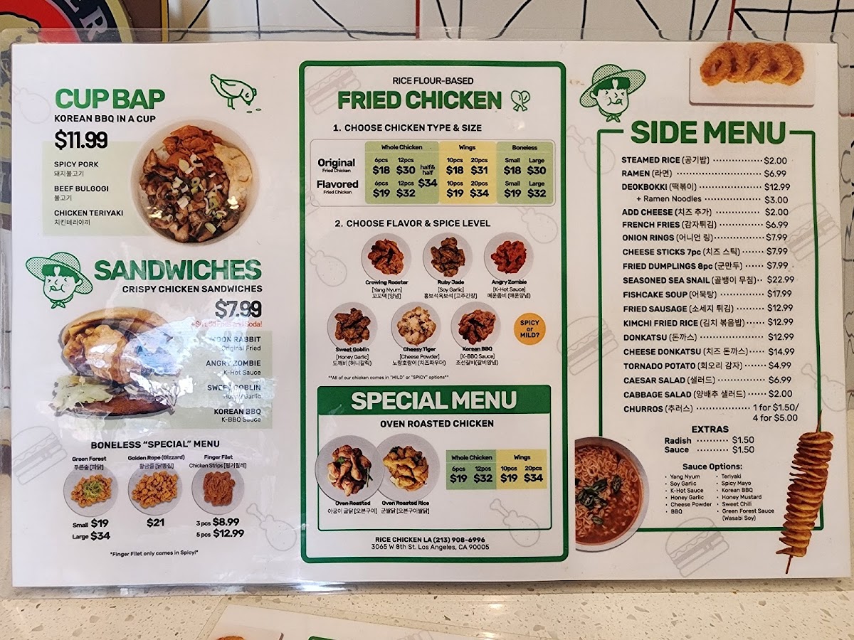 The menu at Rice Chicken on 3065 W 8th St offers a diverse array of dishes that cater to both classic fried chicken lovers and those seeking creative twists. The Boneless "Special" Menu features Finger Filet, Green Forest, and Golden Rope (Gizzard), while the Rice Flour-Based Fried Chicken options include Whole Chicken (Flavored Fried Chicken), Whole Chicken (Half And Half), Wings (Original Fried Chicken), Boneless (Original Fried Chicken), and Boneless (Flavored Fried Chicken), highlighting their commitment to both flavor and variety. For lighter or complementary options, the Side Menu provides Cheese Donkatsu, Seasoned Sea Snail, French Fries, Cheese Sticks 7pc, and Cabbage Salad, giving diners a mix of textures and tastes. Those seeking a convenient, hearty meal can enjoy the Cup Bap selections like Beef Bulgogi, Chicken Teriyaki, and Spicy Pork, or indulge in sandwiches such as Sweet Goblin, Moon Rabbit, Korean BBQ, and Angry Zombie. The Oven Roasted Menu impresses with items like Oven Roasted Whole Chicken, Oven Roasted Rice Wings, Oven Roasted Wings, and Oven Roasted Rice Whole Chicken, offering a slightly lighter yet still satisfying alternative to traditional fried options. For those looking for value, the Rice Chicken Lunch Special combines favorites into specials including 6. Cheese Katsu Special, 1. Sandwich Special, 5. Donkatsu Special, 2. Meal Special, and 4. Fried Rice Special, ensuring there’s something for every appetite. Complementing the menu are simple Extras such as Radish and Sauce, as well as Soft Drinks to round out the meal. Overall, Rice Chicken’s menu strikes a balance between indulgent fried chicken, flavorful boneless options, creative sandwiches, and comforting sides, making it a versatile choice for casual dining in Los Angeles.