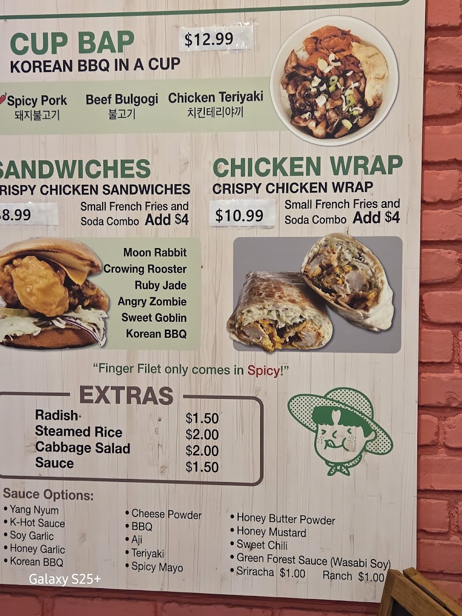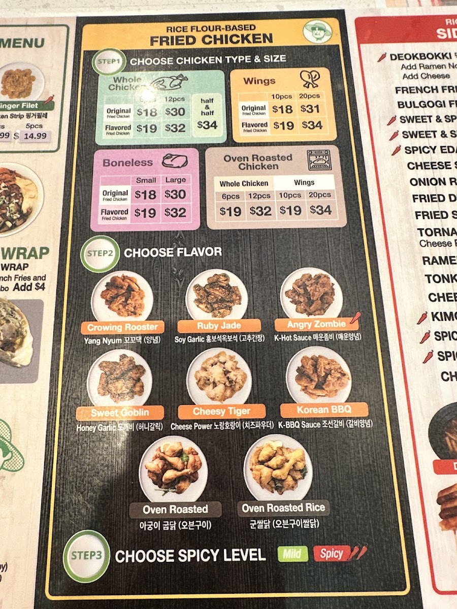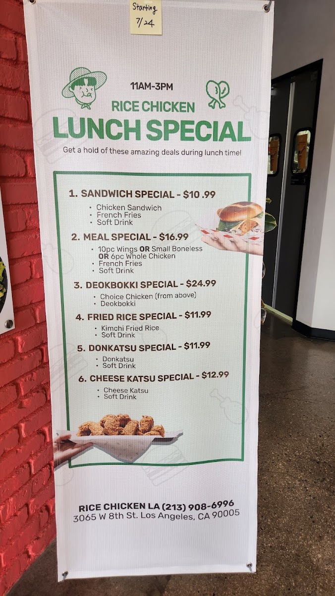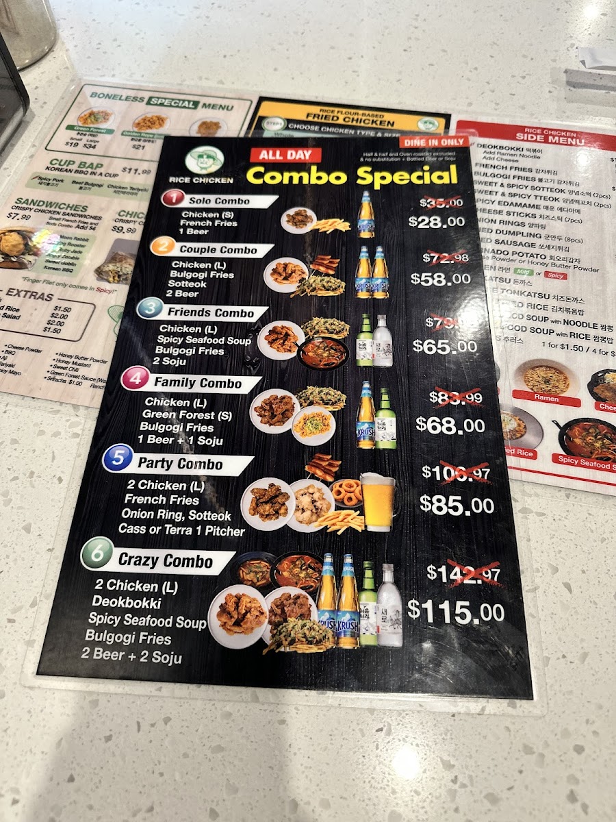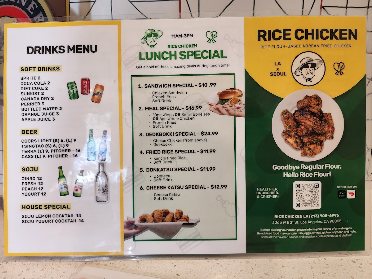 The menu at Rice Chicken on 3065 W 8th St offers a diverse array of dishes that cater to both classic fried chicken lovers and those seeking creative twists. The Boneless "Special" Menu features Finger Filet, Green Forest, and Golden Rope (Gizzard), while the Rice Flour-Based Fried Chicken options include Whole Chicken (Flavored Fried Chicken), Whole Chicken (Half And Half), Wings (Original Fried Chicken), Boneless (Original Fried Chicken), and Boneless (Flavored Fried Chicken), highlighting their commitment to both flavor and variety. For lighter or complementary options, the Side Menu provides Cheese Donkatsu, Seasoned Sea Snail, French Fries, Cheese Sticks 7pc, and Cabbage Salad, giving diners a mix of textures and tastes. Those seeking a convenient, hearty meal can enjoy the Cup Bap selections like Beef Bulgogi, Chicken Teriyaki, and Spicy Pork, or indulge in sandwiches such as Sweet Goblin, Moon Rabbit, Korean BBQ, and Angry Zombie. The Oven Roasted Menu impresses with items like Oven Roasted Whole Chicken, Oven Roasted Rice Wings, Oven Roasted Wings, and Oven Roasted Rice Whole Chicken, offering a slightly lighter yet still satisfying alternative to traditional fried options. For those looking for value, the Rice Chicken Lunch Special combines favorites into specials including 6. Cheese Katsu Special, 1. Sandwich Special, 5. Donkatsu Special, 2. Meal Special, and 4. Fried Rice Special, ensuring there’s something for every appetite. Complementing the menu are simple Extras such as Radish and Sauce, as well as Soft Drinks to round out the meal. Overall, Rice Chicken’s menu strikes a balance between indulgent fried chicken, flavorful boneless options, creative sandwiches, and comforting sides, making it a versatile choice for casual dining in Los Angeles.